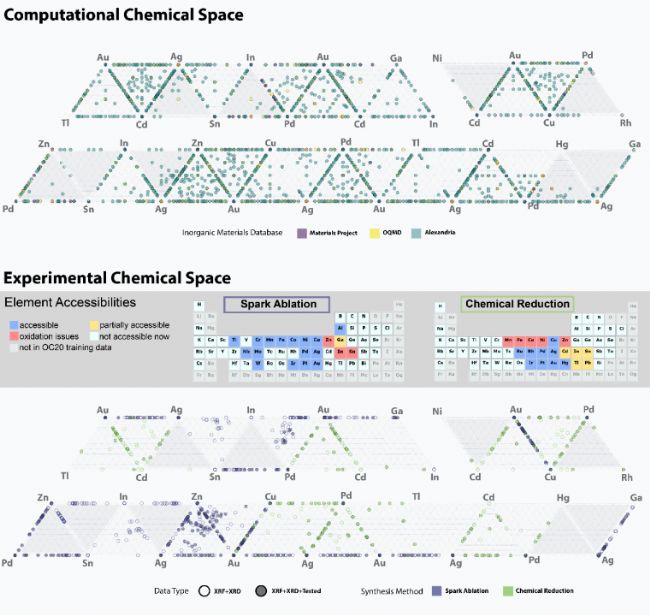 (上)考慮到用于計算數(shù)據的成分多樣性和綜合性,映射和顯示集合了MP、OQMD和 Alexandria的數(shù)據庫源。(下)通過兩種合成方法(化學法和 VSP 火花燒蝕)描述元素的可行性,以及所有實驗合成、表征和測試樣品的Chemical Space。較深陰影的三元相圖是由多個圖連接而成的,該項目未進行探索
