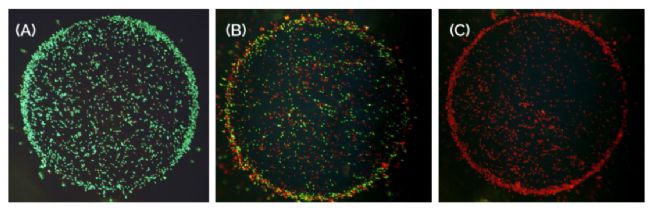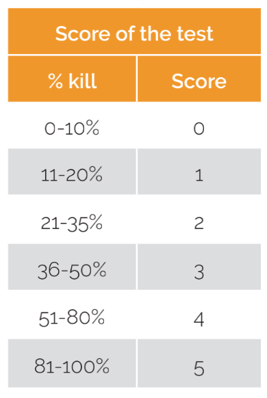 根據(jù)熒光染色結(jié)果確定殺滅百分比 (% kill) 的測量結(jié)果(參見圖 1)。殺滅百分比是陽性細胞(紅色)占陽性和陰性細胞總數(shù)(綠色)的百分比。百分比得分如表 1 所示。