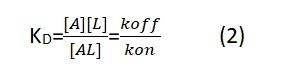 速率常數(shù) (kon 和 koff) 分別表示正向 (結(jié)合) 和反向 (解離) 反應(yīng)。解離平衡常數(shù) KD 表示一半表面固定配體與分析物結(jié)合的時間,可以用游離分析物 [A]、配體 [L] 和分析物-配體復(fù)合物 [AL] 的濃度來表示 (等式 2);蛘撸琄D 可以使用速率常數(shù) kon 和 koff(或者 ka 和 kd)來定義 (等式 2):