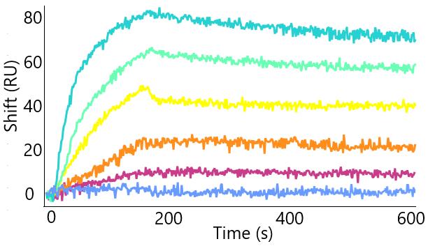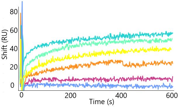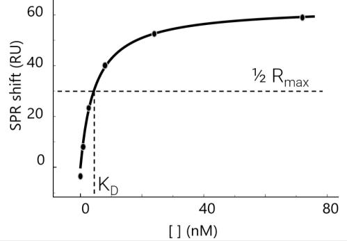 在靜態(tài) SPR 中,只能觀察到結(jié)合階段。圖 4 中顯示了典型的圖形疊加。隨著分析物與固定在表面上的配體結(jié)合,信號逐漸增加。一旦大多數(shù)可用的配體位點被占據(jù),信號就會達(dá)到稱為穩(wěn)定狀態(tài)的平臺,此時配體和分析物結(jié)合和解離之間達(dá)到平衡。曲線的形狀和動力學(xué)還可以提供有關(guān)結(jié)合親和力、結(jié)合速率和分析物-配體相互作用的化學(xué)計量的定性信息。圖 5 中繪制了 SPR 偏移值與濃度的關(guān)系,并通過 Affinité 的 ezControl 軟件獲得了曲線擬合。