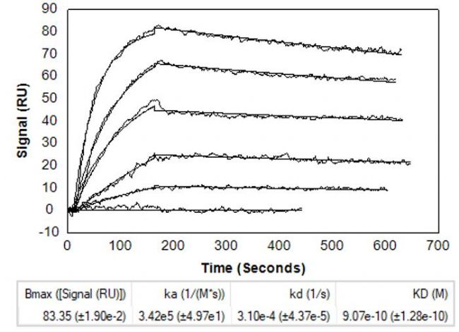 通過此曲線擬合,在 63RU 處評估 Rmax,在 ½ Rmax (KD) 處評估濃度為 4.9nM。