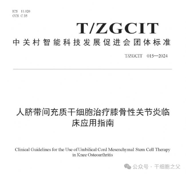 2024年12月30日,中關(guān)村智能科技發(fā)展促進(jìn)會正式發(fā)布了團(tuán)體標(biāo)準(zhǔn)T/ZGCIT 015—2024《人臍帶間充質(zhì)干細(xì)胞治療膝骨性關(guān)節(jié)炎臨床應(yīng)用指南》以下簡稱《指南》)。這一舉措標(biāo)志著我國在利用前沿生物科技手段治療退行性關(guān)節(jié)疾病領(lǐng)域邁出了堅實的一步。