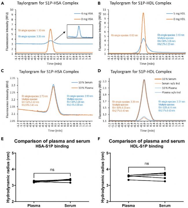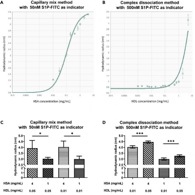 CapMix法:以50 nM S1P-FITC為指示劑,結(jié)果顯示無(wú)論HDL濃度如何,低濃度HSA都會(huì)導(dǎo)致流體動(dòng)力學(xué)半徑(Rh)顯著下降,表明該方法測(cè)定的S1P-FITC與HSA的復(fù)合物形成具有濃度依賴性,且不受HDL濃度影響 。