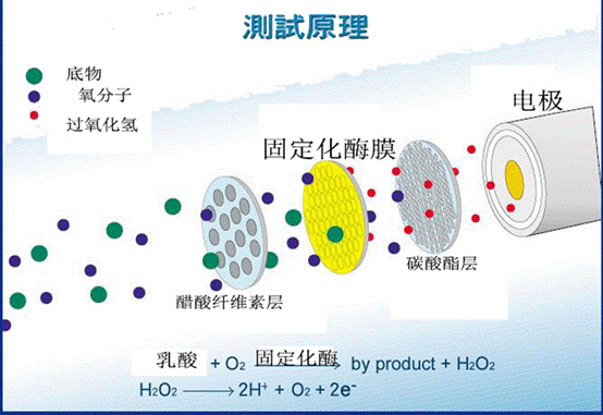 利用生物酶只能催化一種或一類底物的性質(zhì),將氧化酶進(jìn)行固定化處理,樣本中的底物在氧化酶的催化下被催化生成過氧化氫,根據(jù)電化學(xué)的原理,過氧化氫的濃度與電壓值正相關(guān),根據(jù)標(biāo)準(zhǔn)液、緩沖液的電壓值響應(yīng)值來確定樣本中底物濃度。