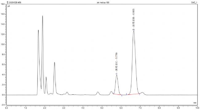 新霉素的主要成分—新霉素B和新霉素C峰形佳,分離度遠(yuǎn)大于1.5,樣品中新霉素C和B均不受干擾,可輕松進(jìn)行新霉素各組分的定量分析。