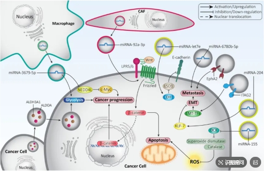 癌細(xì)胞增殖異常增加,是癌細(xì)胞區(qū)別于正常細(xì)胞的因素之一。細(xì)胞周期進(jìn)程加快、凋亡抑制和糖酵解被認(rèn)為是癌癥生長的主要因素?焖俜至训陌┘(xì)胞需要高水平的能量來維持其增殖。氧化磷酸化是一個緩慢的過程,不能為腫瘤細(xì)胞提供滿足其需要的能量。因此,代謝從氧化磷酸化轉(zhuǎn)變?yōu)樘墙徒獗粏,抑制糖酵解被認(rèn)為是一種有前景的癌癥治療策略。外泌體從照射過的肺癌細(xì)胞中分離出來。他們表現(xiàn)出高水平的ALDOA和ALDH3A1,刺激糖酵解增加肺癌增殖。巨噬細(xì)胞來源的外泌體具有高水平的miRNA-3679-5p,并通過降低NEDD4L的表達(dá)來促進(jìn)c-Myc的穩(wěn)定性,導(dǎo)致肺癌生長,并誘導(dǎo)糖酵解。細(xì)胞凋亡是腫瘤中受外泌體調(diào)控的重要信號通路。抑制細(xì)胞凋亡可能為腫瘤的發(fā)展和治療的耐藥性鋪平道路。腫瘤相關(guān)成纖維細(xì)胞分泌含有miRNA92a-3p的外泌體,該外泌體作為促腫瘤因子,誘導(dǎo)Wnt/β-catenin軸,導(dǎo)致抑制線粒體凋亡,誘導(dǎo)結(jié)直腸癌細(xì)胞對5-氟尿嘧啶產(chǎn)生耐藥性。ROS可誘導(dǎo)癌細(xì)胞凋亡。在胰腺癌中,含有miRNA-155的外泌體會降低參與吉西他濱代謝的酶DCK的表達(dá)。隨之而來的是超氧化物歧化酶和過氧化氫酶的增加,導(dǎo)致ROS的減少和隨后癌細(xì)胞的生長,并介導(dǎo)它們對化療的耐藥性(如圖2)。
