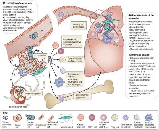 外泌體是由腫瘤細(xì)胞脫落的小囊泡結(jié)構(gòu),并提供各種自分泌和旁分泌信號線索,最終導(dǎo)致繼發(fā)部位形成轉(zhuǎn)移。如圖3所示,腫瘤來源的外泌體參與(A)轉(zhuǎn)移的啟動,這可能與EMT通路共選,以增強腫瘤細(xì)胞的侵襲性和運動性,并清除防止轉(zhuǎn)移的天然屏障;(B) 通過募集 BMDC、肌成纖維細(xì)胞活化和誘導(dǎo) ECM 重塑和血管生成過程來制備轉(zhuǎn)移前生態(tài)位;(C)腫瘤細(xì)胞從免疫監(jiān)視中逃脫,這可能通過抑制宿主免疫的先天性和適應(yīng)性臂來實現(xiàn),并將反應(yīng)性腫瘤浸潤轉(zhuǎn)化為惡性腫瘤的幫兇。