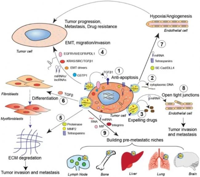 如圖4所示,腫瘤外泌體(1)通過分泌TGFβ1或其他配體抑制腫瘤細(xì)胞凋亡;(2)將胞漿DNA泵出以維持細(xì)胞穩(wěn)態(tài)。(3)外泌體排出細(xì)胞毒藥物,導(dǎo)致腫瘤細(xì)胞產(chǎn)生耐藥性。(4)腫瘤外泌體將其貨物(如EGFRVIII、KRAS、SRC、TGFβ1、EMT drivers、PDL1、GSTP1、lncRNAs或miRNA)轉(zhuǎn)運至其他腫瘤細(xì)胞,誘導(dǎo)受體細(xì)胞發(fā)生EMT、遷移侵襲或產(chǎn)生耐藥性,進(jìn)而促進(jìn)腫瘤進(jìn)展和轉(zhuǎn)移。腫瘤外泌體可以(5)通過蛋白酶、MMP2或四跨膜蛋白重編程ECM,或(6)通過TGFβ1誘導(dǎo)成纖維細(xì)胞分化為肌成纖維細(xì)胞,從而進(jìn)一步誘導(dǎo)ECM降解;它們還可以 (7) 通過轉(zhuǎn)移可溶性 E-鈣粘蛋白 (SE-Cad)、DLL4、四跨膜蛋白或 miRNA 來增強內(nèi)皮細(xì)胞增殖和血管生成,以及 (8) 通過 miRNA 打開內(nèi)皮細(xì)胞中的緊密連接,導(dǎo)致腫瘤進(jìn)展和轉(zhuǎn)移。(9) 腫瘤外泌體攜帶特定的整合素、巨噬細(xì)胞抑制因子、mRNA 或 miRNA,使其能夠在淋巴結(jié)、骨骼、肝臟、肺和腦中建立轉(zhuǎn)移前微環(huán)境。
