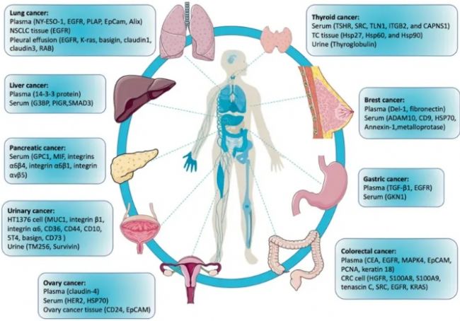 圖5 多種類型人類癌癥的外泌體蛋白生物標(biāo)記物