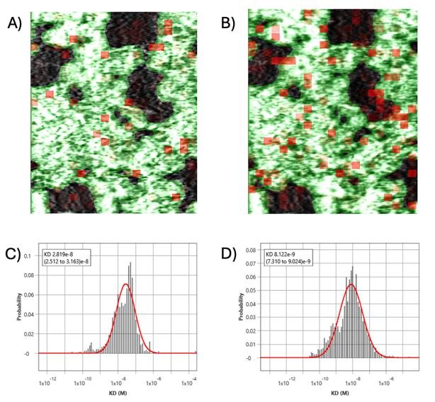 圖 3 (A)4n與過表達(dá)ADRA2A的Chem-1細(xì)胞結(jié)合的結(jié)合數(shù)據(jù),以及(B)育亨賓與Chem-1細(xì)胞結(jié)合;SPR圖像上的ROI方塊表示檢測到結(jié)合事件的區(qū)域。從每個ROI提取的動力學(xué)結(jié)合參數(shù)匯總形成了4n(C)和育亨賓(D)的解離常數(shù)(KD)直方圖