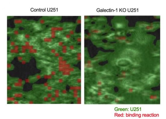圖 5 米諾環(huán)素與半乳糖凝集素-1結(jié)合的SPRm 200檢測結(jié)果。綠色區(qū)域顯示測量芯片上的腫瘤細(xì)胞(對照組U251和半乳糖凝集素-1敲除U251),紅色區(qū)域顯示米諾環(huán)素與腫瘤細(xì)胞的結(jié)合相互作用
