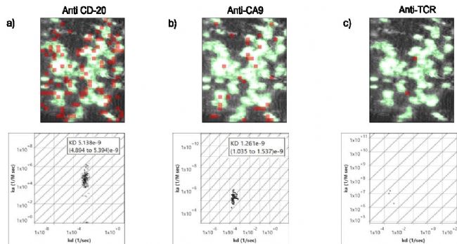 圖 7 SPR圖像顯示綠色突出顯示的細(xì)胞區(qū)域,紅色突出顯示的區(qū)域表示檢測到的a)抗CD20,b)抗CA9和c)抗TCR結(jié)合相互作用,以及從數(shù)百個響應(yīng)的ROI中提取的相應(yīng)親和力等溫線圖,顯示了在懸浮活Ramos B細(xì)胞上三種抗體相互作用的總動力學(xué)相互作用