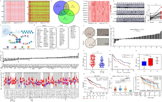 通過TCGA數(shù)據(jù)庫篩選出FBL在肝癌組織中顯著高表達(dá)(左圖A-F);通過肝癌組織芯片確定FBL在肝癌患者中顯著高表達(dá)并且和生存期相關(guān)(右圖A-J)。