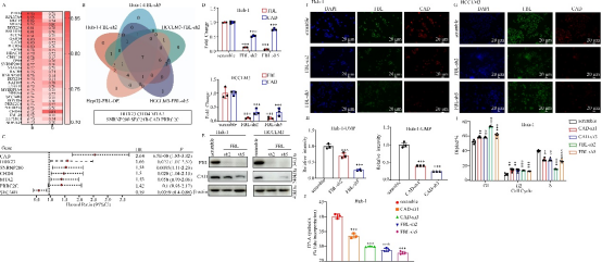 通過分析數(shù)據(jù)庫中CAD基因與FBL蛋白和mRNA表達(dá)的相關(guān)性,我們發(fā)現(xiàn)CAD與FBL的表達(dá)呈較高的相關(guān)性,并且與預(yù)后相關(guān)性最為顯著。通過RT-qPCR和Western blot實(shí)驗(yàn),敲減FBL后的HCC細(xì)胞中CAD的mRNA和蛋白水平顯著下調(diào)。免疫熒光實(shí)驗(yàn)進(jìn)一步顯示,F(xiàn)BL敲減的細(xì)胞中CAD的熒光強(qiáng)度明顯降低。