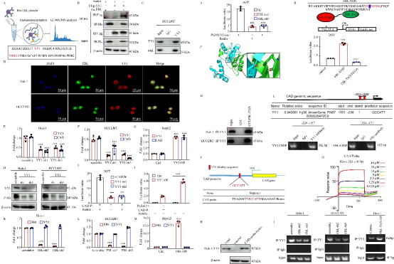 FBL可以和轉(zhuǎn)錄因子YY1蛋白結(jié)合(左圖A-M);FBL通過隱藏的轉(zhuǎn)錄激活結(jié)構(gòu)域(TAD)和YY1結(jié)合從而調(diào)控CAD表達(dá)(右圖A-I)。