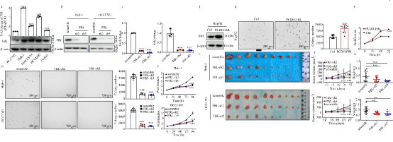 在HCC細(xì)胞中敲減FBL后,細(xì)胞的增殖能力和軟瓊脂克隆形成能力顯著下降。相反,F(xiàn)BL蛋白表達(dá)上調(diào)則明顯增強(qiáng)了HepG2細(xì)胞的增殖和克隆形成能力。此外,在FBL敲減的HCC細(xì)胞移植瘤模型中,腫瘤生長(zhǎng)被顯著抑制,進(jìn)一步驗(yàn)證了FBL在HCC發(fā)生發(fā)展中的促癌作用。