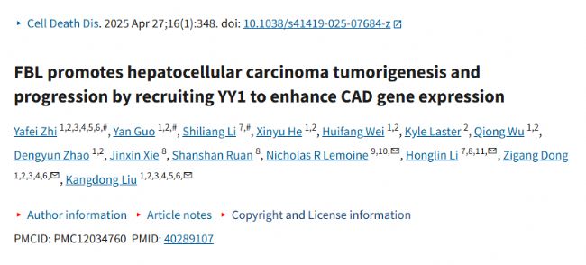 綜上所述,本研究在HCC患者腫瘤組織中觀察到FBL蛋白質(zhì)水平顯著上升。通過CDX、PDX、DEN誘導(dǎo)的FBL肝臟特異性敲除小鼠肝癌模型的體內(nèi)研究顯示,F(xiàn)BL在HCC的發(fā)生和進(jìn)展過程中扮演著關(guān)鍵的角色。我們發(fā)現(xiàn)FBL與CAD mRNA和蛋白水平之間存在顯著的正相關(guān),且CAD的表達(dá)受FBL和轉(zhuǎn)錄因子YY1的共同調(diào)控。我們篩選并驗(yàn)證了氟達(dá)拉濱磷酸鹽作為一種新型FBL抑制劑,能夠顯著抑制HCC體內(nèi)外的生長(zhǎng)。我們的研究強(qiáng)調(diào)了FBL-YY1-CAD軸在HCC中的促癌作用。