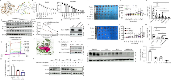 基于FBL蛋白的晶體結(jié)構(gòu),從化合物庫中篩選出特異性靶向 FBL的抑制劑氟達(dá)拉濱磷酸鹽。進(jìn)一步通過MTT實(shí)驗(yàn)和平板克隆實(shí)驗(yàn)證實(shí),氟達(dá)拉濱磷酸鹽能夠有效抑制肝癌細(xì)胞的增殖。通過熱位移實(shí)驗(yàn)、SPR和IP實(shí)驗(yàn)進(jìn)一步驗(yàn)證了氟達(dá)拉濱磷酸鹽與FBL的結(jié)合。氟達(dá)拉濱磷酸鹽作為FBL抑制劑,與樂伐替尼聯(lián)合應(yīng)用,能夠顯著抑制肝癌的進(jìn)展。