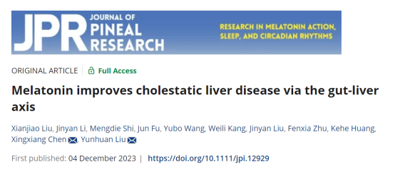2023年11月8日,南京農(nóng)業(yè)大學動物醫(yī)學院臨床獸醫(yī)學黃克和教授團隊在《Journal of Pineal Research》(IF8.3)發(fā)表題為“Melatonin improves cholestatic liver disease via the gut‐liver axis”的研究論文,南京農(nóng)業(yè)大學動物醫(yī)學院博士研究生劉鮮姣為文章第一作者,南京農(nóng)業(yè)大學動物醫(yī)學院青年教師劉云歡、陳興祥教授為文章通訊作者。南京農(nóng)業(yè)大學動物醫(yī)學院臨床獸醫(yī)學動物營養(yǎng)與健康實驗室為該研究提供了技術和平臺支持。