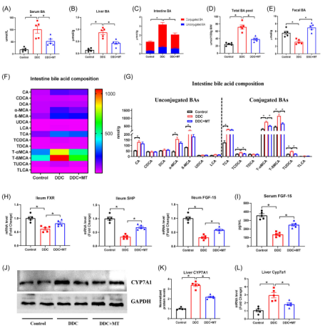 MT處理的DDC喂養(yǎng)小鼠體內(nèi)BA代謝分析結果表明,MT降低了DDC喂養(yǎng)小鼠血清、肝臟、腸道和總BA的水平,升高了糞便中的BA水平。代謝組學分析顯示,DDC喂養(yǎng)小鼠的腸道結合膽汁酸水平(T-βMCA、T-αMCA和TUDCA)顯著升高,MT處理后顯著降低。此外,MT逆轉了DDC喂養(yǎng)小鼠中回腸FXR、SHP和FGF-15 mRNA的表達水平和血清FGF-15水平。有趣的是,DDC喂養(yǎng)小鼠肝臟CYP7A1(BA合成限速酶)蛋白和mRNA水平顯著升高,而MT處理后顯著降低。這表明MT是通過上調(diào)腸道FXR/FGF-15軸的表達來減少DDC喂養(yǎng)小鼠肝臟BA合成。
