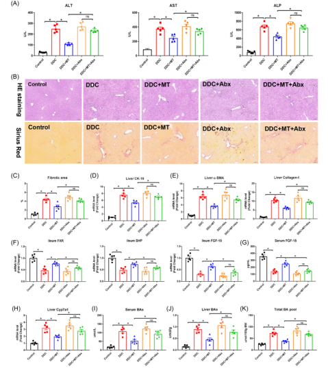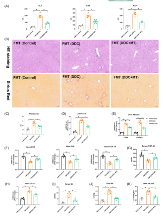 為進一步驗證腸道微生物在MT改善DDC小鼠肝損傷過程中的作用,研究人員進行了糞菌移植試驗。結果表明,與FMT (DDC)組相比,F(xiàn)MT (DDC+MT)小鼠的肝損傷和纖維化減輕了,血清ALT、AST和ALP水平也降低,回腸FXR、SHP和FGF-15的mRNA表達顯著上調(diào),血清FGF-15水平也明顯上調(diào),而肝臟CYP7A1 mRNA表達降低。此外,F(xiàn)MT (DDC+MT)組小鼠血清、肝臟和總BA水平均降低了。該結果再次證明了腸道菌群介導了MT對DDC誘導的肝損傷的改善作用和對BA的抑制作用。