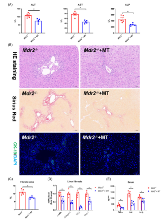 最后,研究人員用Mdr2-/-小鼠(膽汁淤積模型鼠)進一步闡明了MT對肝損傷和纖維化的保護作用及機制。結果表明,MT顯著降低Mdr2-/-小鼠的肝臟血清生化指標,改善了肝損傷和纖維化。此外,MT還顯著降低Mdr2-/-小鼠纖維化標記物和炎癥標記物的mRNA表達水平。該結果表明MT可改善Mdr2-/-小鼠的肝損傷、炎癥和肝纖維化。
