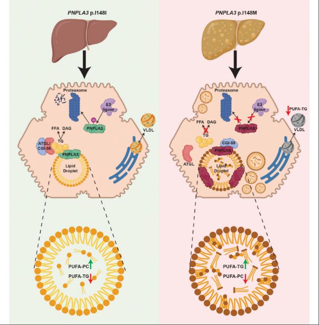 圖1. PNPLA3 I148M 遺傳變異與肝細(xì)胞脂肪肝病關(guān)聯(lián)機(jī)制示意圖[5]