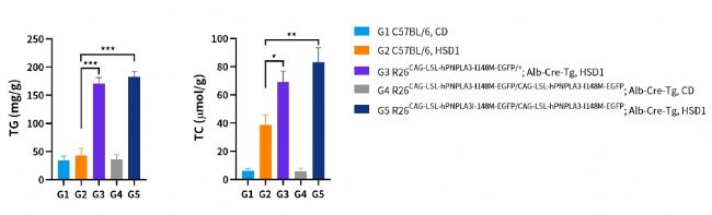 圖6. HSD誘導(dǎo)6周后各組小鼠肝臟中甘油三酯(TG)和總膽固醇(T-CHO)含量。結(jié)果顯示,HSD飲食誘導(dǎo)下,肝臟特異性過表達(dá)hPNPLA3 I148M小鼠TG、T-CHO含量顯著增加。