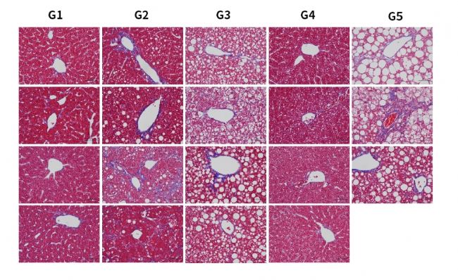 圖8. HSD誘導(dǎo)6周后各組小鼠Masson染色代表圖。結(jié)果顯示,HSD飲食誘導(dǎo)下,肝臟特異性過表達(dá)hPNPLA3 I148M小鼠出現(xiàn)明顯纖維化(G3,G5)。