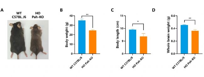 圖1. Pah-KO小鼠模型產(chǎn)生類苯丙酮尿癥表型:體重、腦重降低
