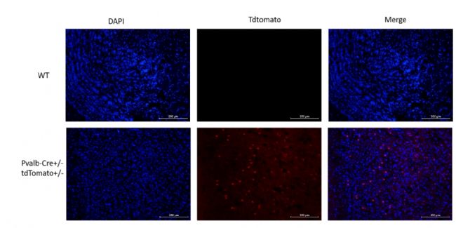 圖6. 熒光檢測PvalbCre+/-; Rosa26tdTomato+/-小鼠大腦皮層中間神經(jīng)元tdTomato的表達?梢娂t色陽性信號。