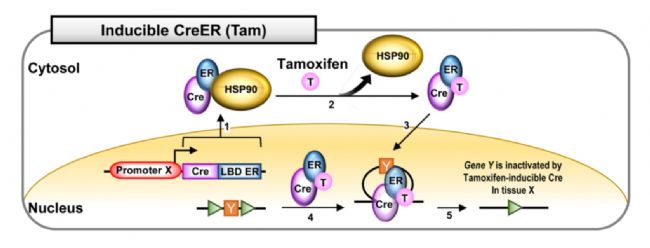 為更準確地進行遺傳功能研究,時間特異性的Cre-lox(也叫誘導(dǎo)型Cre-lox)被開發(fā)出來,如CreER系統(tǒng),將Cre改造為與雌激素受體ER融合的蛋白CreER(或CreERT2),可在特定時間點利用tamoxifen激活Cre重組酶的功能,實現(xiàn)目的基因的時空特異性表達/敲除。