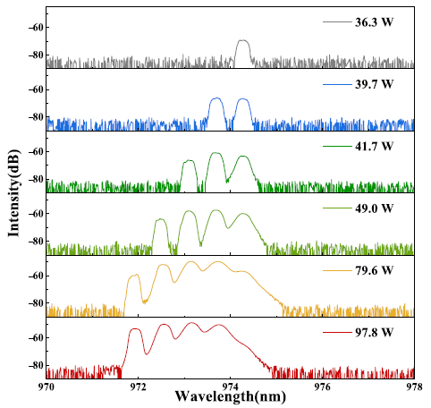 圖中所示的結(jié)果表明,在光譜中較短波長(zhǎng)處觀察到的峰數(shù)隨著泵浦功率的增加而增加,這表明在輸出中高階模式的出現(xiàn)率有所提高。這種模式行為可歸因于泵浦源的多模特性。隨著功率的增加,高階模式的拉曼激光依次達(dá)到閾值。這些現(xiàn)象在光譜中體現(xiàn)如下:隨著泵浦功率的升高,長(zhǎng)波長(zhǎng)處的峰值強(qiáng)度會(huì)減弱,而短波長(zhǎng)處則會(huì)出現(xiàn)新的峰值。