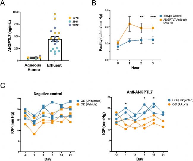 圖4. ANGPTL7特異性抗體能夠在實(shí)驗(yàn)動(dòng)物體內(nèi)有效降低眼壓(IOP) [9]。
