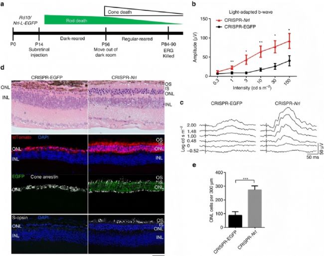 圖6. CRISPR介導(dǎo)的NRL敲除挽救了Rd10小鼠的視網(wǎng)膜功能 [11]。