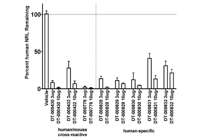 圖7. NRL人源化小鼠用于靶向人類NRL的siRNA藥物的篩選和敲低效率研究 [14]。