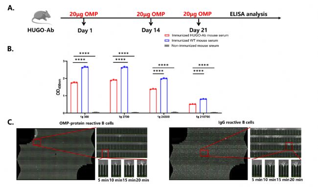 研究人員使用了OMP免疫HUGO-Ab®全人源單克隆抗體小鼠(由賽業(yè)生物提供)。在三輪免疫后,免疫組中Omp38特異性多克隆抗體的滴度顯著高于未免疫組(圖1A, 1B)。之后將抗體鼠脾臟中的CD138陽(yáng)性漿細(xì)胞上樣到Berkeley Lights Beacon®單細(xì)胞光導(dǎo)平臺(tái),基于分泌抗體與抗原微球的結(jié)合篩選陽(yáng)性漿細(xì)胞。通過(guò)OEP技術(shù),在一張篩選芯片中導(dǎo)入了9021個(gè)漿細(xì)胞,其中2029個(gè)微腔分泌IgG抗體,而其中60個(gè)分泌Omp38蛋白特異性抗體(圖1C)。對(duì)這些分泌抗原特異性抗體的單B細(xì)胞全部導(dǎo)出,基于RT-PCR方法擴(kuò)增單B細(xì)胞抗體VH/VL序列。最終,實(shí)驗(yàn)人員獲得24對(duì)VH/VL配對(duì)的抗體序列。