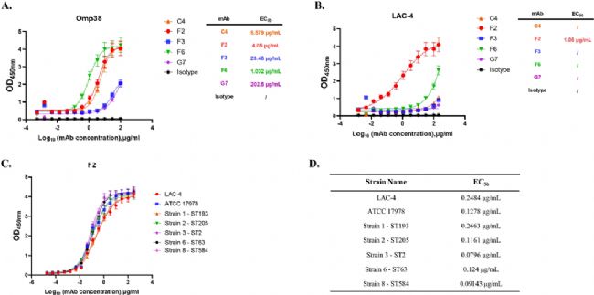 為了評(píng)估全人源mAb F2對(duì)高毒力菌株LAC-4的保護(hù)效力,研究人員將致死劑量的LAC-4經(jīng)氣管接種到小鼠體內(nèi),隨后注射Omp38特異性單抗,并在感染后72小時(shí)監(jiān)測(cè)存活率。結(jié)果顯示,mAb F2在致死感染小鼠模型中未表現(xiàn)出保護(hù)作用。他們推測(cè),人源化抗體的Fc片段可能與小鼠FcγR存在不相容性。后續(xù)可采用恒河猴等大型哺乳動(dòng)物模型,以便更準(zhǔn)確評(píng)估全人源單克隆抗體的治療效果。此外,LAC-4菌株的厚莢膜也許導(dǎo)致mAb F2無(wú)法接觸Omp38。