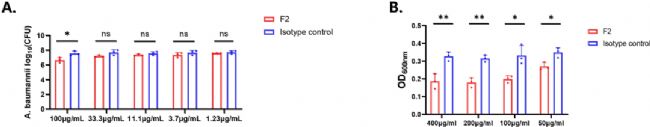 在本研究中,研究團(tuán)隊(duì)采用賽業(yè)生物HUGO-Ab全人源抗體小鼠進(jìn)行免疫,并依托高通量單細(xì)胞篩選平臺(tái),在一個(gè)月內(nèi)成功篩選出25株靶向鮑曼不動(dòng)桿菌外膜蛋白的單克隆抗體。值得注意的是,其中一株命名為F2的抗體表現(xiàn)出高效且廣譜的結(jié)合活性,不僅能強(qiáng)力結(jié)合多種鮑曼不動(dòng)桿菌菌株,還可抑制細(xì)菌附著與生物膜形成。研究人員認(rèn)為,對(duì)F2的進(jìn)一步研究和開(kāi)發(fā)有望提供新的治療方案,最終促進(jìn)人們?cè)谂R床環(huán)境中更有效地管理和控制鮑曼不動(dòng)桿菌感染。