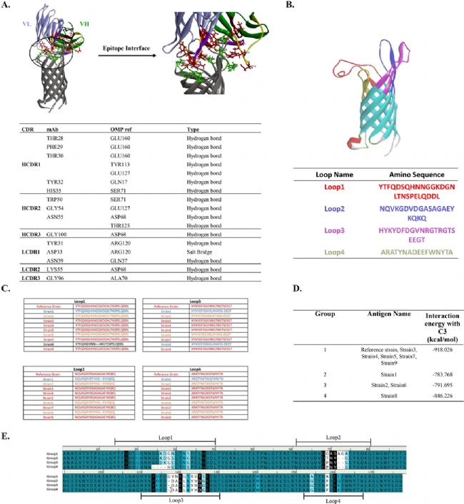 基于Alphafold3和GeoBiologics的預(yù)測(cè)顯示,mAb F2與Omp38胞外區(qū)的四個(gè)loop結(jié)構(gòu)結(jié)合(圖4)。根據(jù)Omp38 loop結(jié)構(gòu)的不同,研究人員將9個(gè)菌株分為四組,并基于同源建模構(gòu)建了四種結(jié)合構(gòu)象。相互作用能計(jì)算分析顯示,mAb F2與Group1(strain3)的結(jié)合親和力最強(qiáng),其次是Group4(strain8),與ELISA分析的結(jié)果一致。
