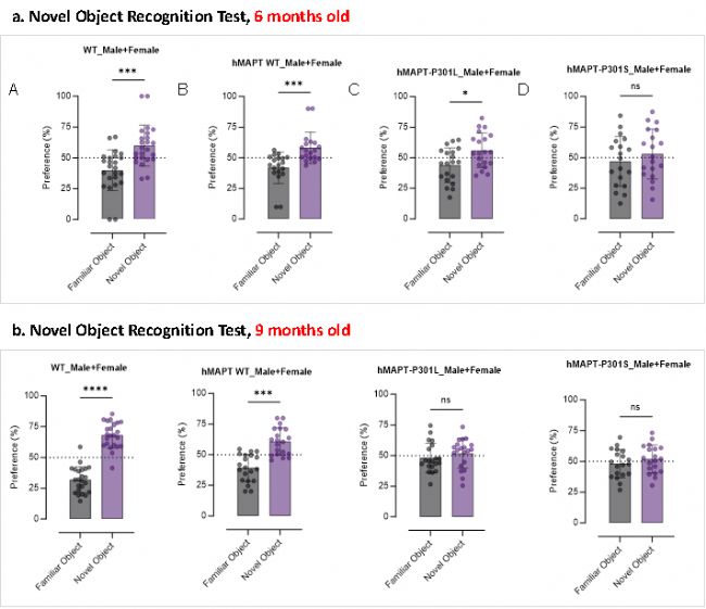 在新物體識別實(shí)驗(yàn)中,B6-hTau*P301L小鼠和B6-hTau*P301S小鼠對新舊物體沒有表現(xiàn)出顯著偏好,表明其情景記憶功能存在明顯損傷。作為對比,野生型(WT)小鼠和B6-hTau小鼠則表現(xiàn)出正常的偏好行為。