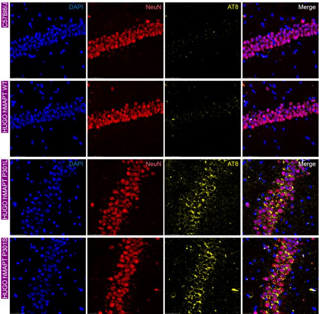 在B6-hTau*P301L小鼠和B6-hTau*P301S小鼠海馬組織中,可檢測到磷酸化Tau蛋白(AT8)的顯著積聚,并伴隨神經(jīng)元結(jié)構(gòu)紊亂,而野生型小鼠和B6-hTau小鼠均未出現(xiàn)此類病理。
