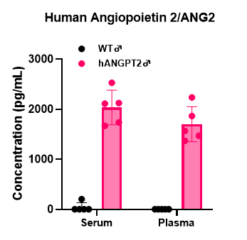 圖6. 8周齡雄性B6-hANG2(ANGPT2)小鼠和野生型小鼠(WT)血清和血漿中人源蛋白表達檢測。
