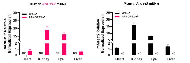 圖4. 5周齡雄性純合B6-hANG2(ANGPT2)小鼠和野生型小鼠(WT)的Angpt2 mRNA表達檢測。
