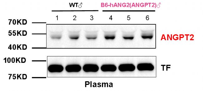 圖5. 8周齡雄性B6-hANG2(ANGPT2)小鼠和野生型小鼠(WT)的蛋白表達檢測。