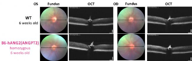 圖7. 6周齡純合B6-hANG2(ANGPT2)小鼠和野生型小鼠(WT)的眼底形態(tài)(Fundus)和光學(xué)相干斷層掃描(OCT)檢測結(jié)果。