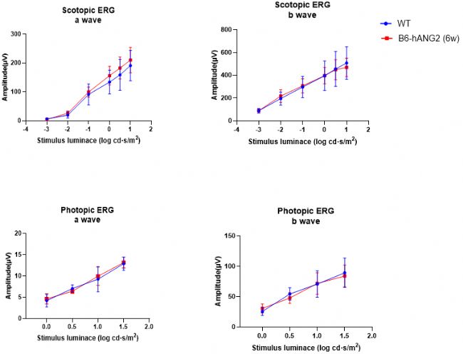 6周齡純合B6-hANG2(ANGPT2)小鼠暗適應(yīng)(Scotopic)和明適應(yīng)(Photopic)的a波、b波振幅幾乎與野生型相同。