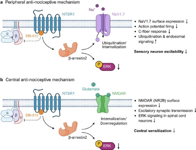 在外周神經(jīng)系統(tǒng)(PNS)中,痛覺(jué)的產(chǎn)生與感覺(jué)神經(jīng)元興奮性升高有關(guān)。SBI-810通過(guò)招募βarr2至NTSR1,引發(fā)NaV1.7內(nèi)化與泛素化,并抑制ERK磷酸化。此通路最終降低神經(jīng)元興奮性、動(dòng)作電位及C纖維反應(yīng),從而緩解疼痛。