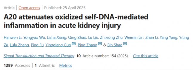 [1]Li, H., Wu, Y., Xiang, L. et al. A20 attenuates oxidized self-DNA-mediated inflammation in acute kidney injury. Sig Transduct Target Ther 10, 154 (2025). https://doi.org/10.1038/s41392-025-02194-y