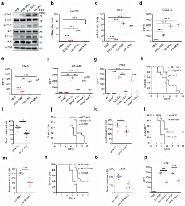 研究人員進一步探究了氧化自身DNA是否通過激活STING信號通路來加劇AKI的進展。他們發(fā)現(xiàn),AKI小鼠腎組織中STING信號通路相關(guān)蛋白的表達水平顯著升高,并且促炎細胞因子的mRNA水平也升高。在體外實驗中,氧化自身DNA刺激也顯著增加了STING信號通路相關(guān)蛋白的表達水平,并伴隨著Cxcl10和Ifn-β mRNA水平的升高以及CXCL10和IFN-β的過度分泌。此外,使用STING基因敲除小鼠進行實驗發(fā)現(xiàn),Sting−/−小鼠在注射順鉑和AAI后,CXCL10和IFN-β的分泌減少,生存率提高,血清肌酐水平降低。然而,抑制STING通路僅適度改善了AKI小鼠的生存率和腎損傷。